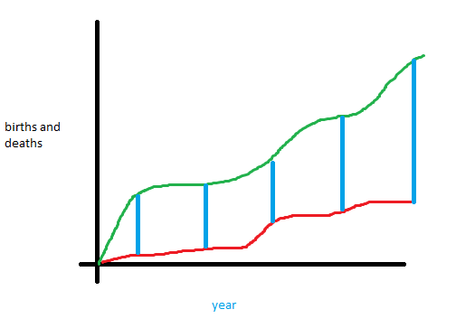 Green represents the amount of births accumulated over a period of time. And red represents the accumulation of deaths of time. The difference of births and deaths (outlined in blue) indicates to us the amount of people who are alive of said current year.