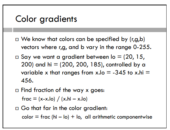 The basic idea behind a gradient is that there is a start and ending color, everything in between these two colors is some fraction in between.